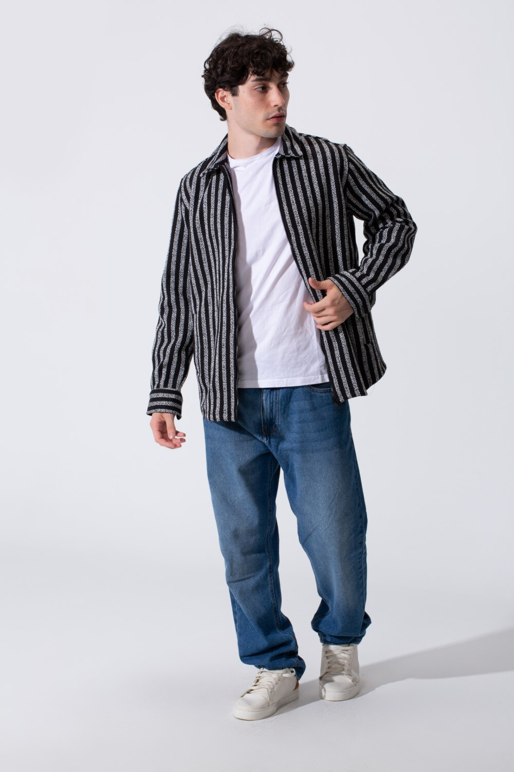 Men's Winter Long Sleeved Regular Fit Striped Shirt With A Full Front Zipper