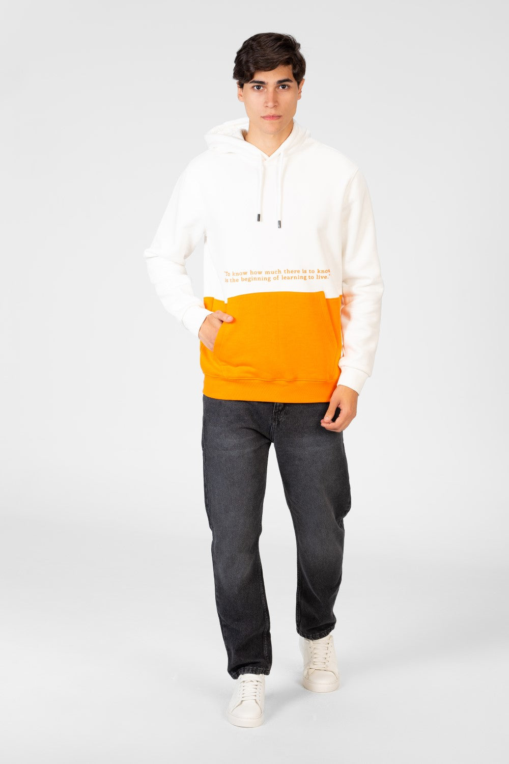 This isn't just any hoodie; it's a statement piece. Featuring a distinctive two-tone design and a bold text print on the front, it adds a unique edge to any casual outfit. Crafted for comfort and durability, it’s perfect for staying warm and looking sharp.